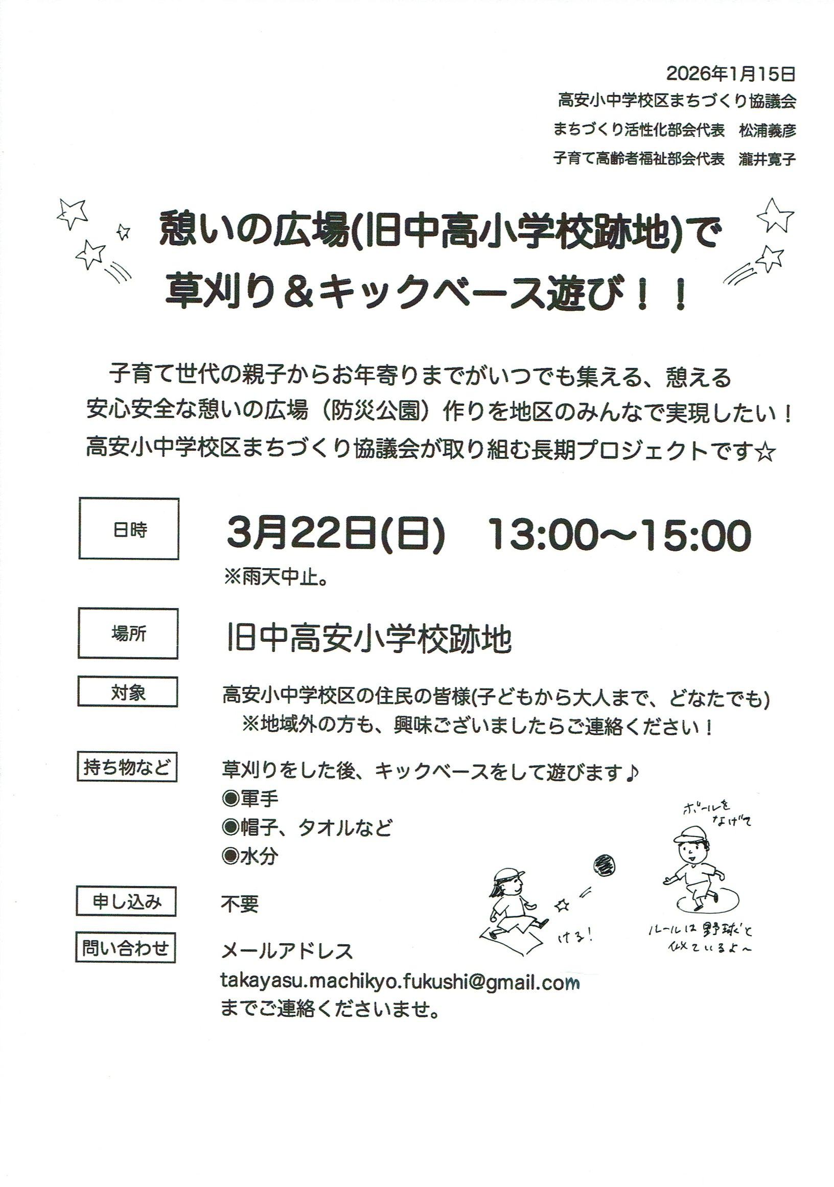 3月22日 憩いの広場 旧中高安小学校跡地で草刈り&キックベース遊び