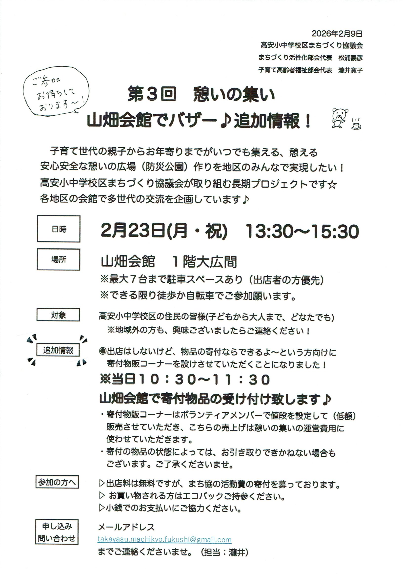 2月23日 第3回 憩いの集い 山畑会館でバザー