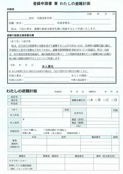 なお「登録申請書兼わたしの避難計画書」は各地区にて管理運用しますので、お問い合わせは各地区へお願いいたします。