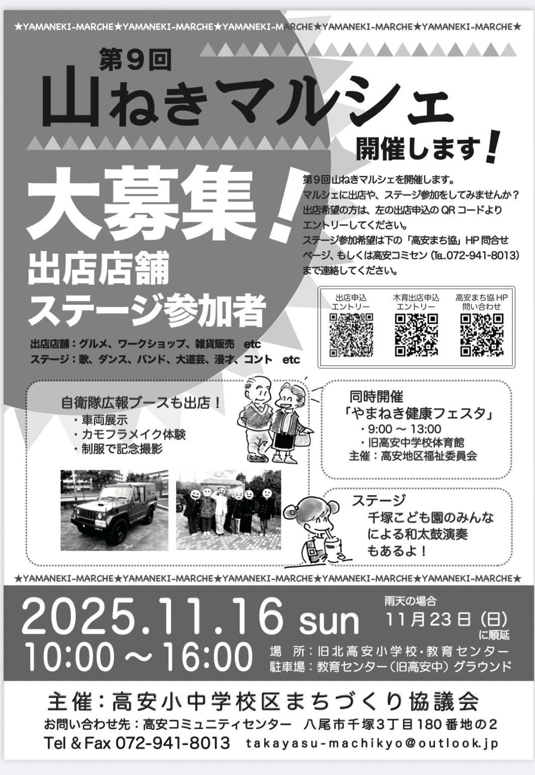 第9回山ねきマルシェ出店者募集のお知らせ 募集期限 2025/9/23 飲食、物販、ワークショップなどの出店希望の方はこちらから👈 木育スペース(加工や木育関係ワークショップ)への出店はこちら👈 もしくは下記チラシのQRコードからエントリーください。